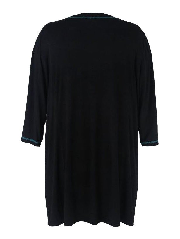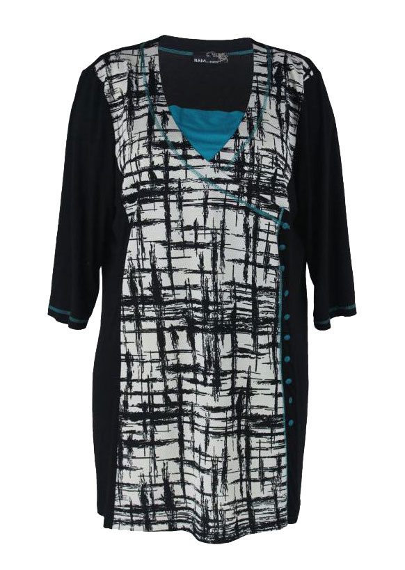 Flot tunika med v-udskæringseffekt. Tunikaen har en ensfarvet sort ryg og sorte ¾ lange ærmer. Fronten er fuld af gode effekter og et flot grafisk mønster. Fronten har tydelige turkise syninger og ned langs venstre side er der 10 turkis pynteknapper. I v-halsen er der indsat et turkis stykke stof, der gør at tunikaen får et virkeligt smart og unikt look.