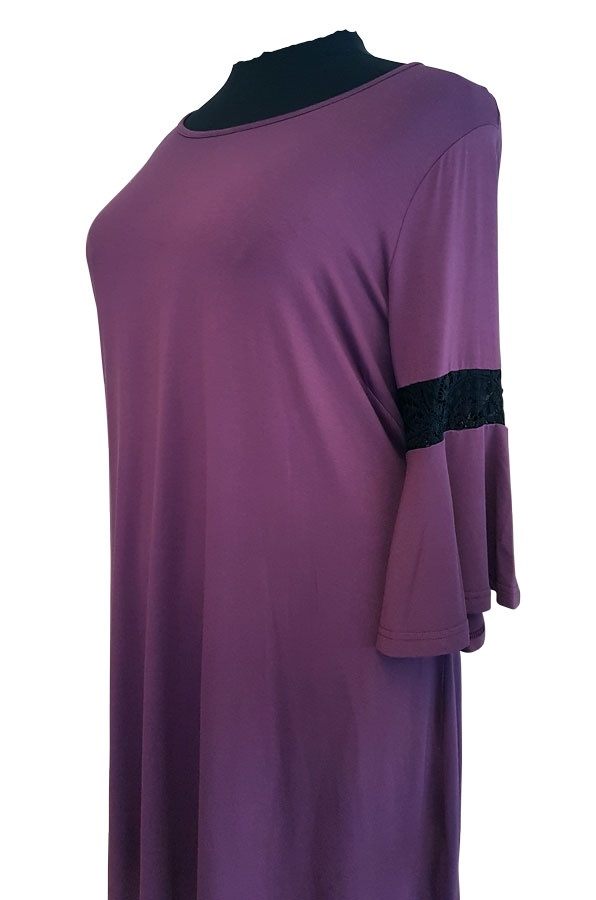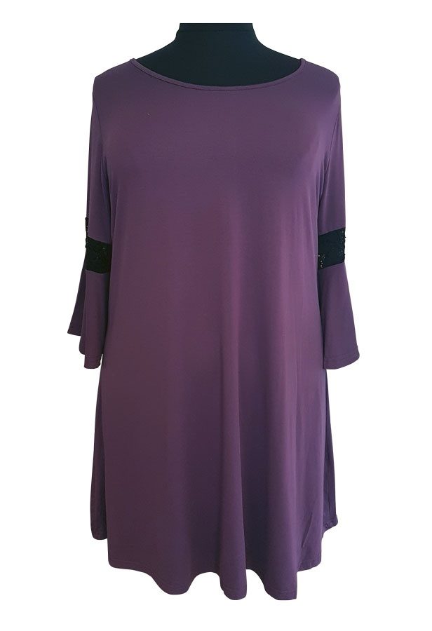 Sød mørklilla tunika i en meget lækker jersey metervare. Tunikaen er med ¾ lange ærmer, midt på ærmet er der indsat en sort blondebort, og herefter er ærmerne løse. Tunikaen er med rund halsudskæring. Bagpå er der en nøglehulsåbning ved halsen, der lukkes med en lille lilla knap.