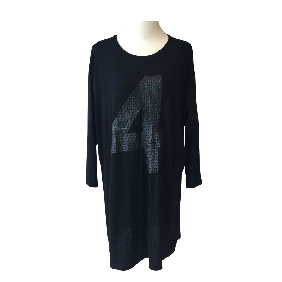 Smart oversize tunika med rund hals og flagermusærmer. Ærmerne er ¾ lange og øverst på hver ærme er der indsyet et stykke hulmønstret stof. På fronten er der et stort sort 4-tal.