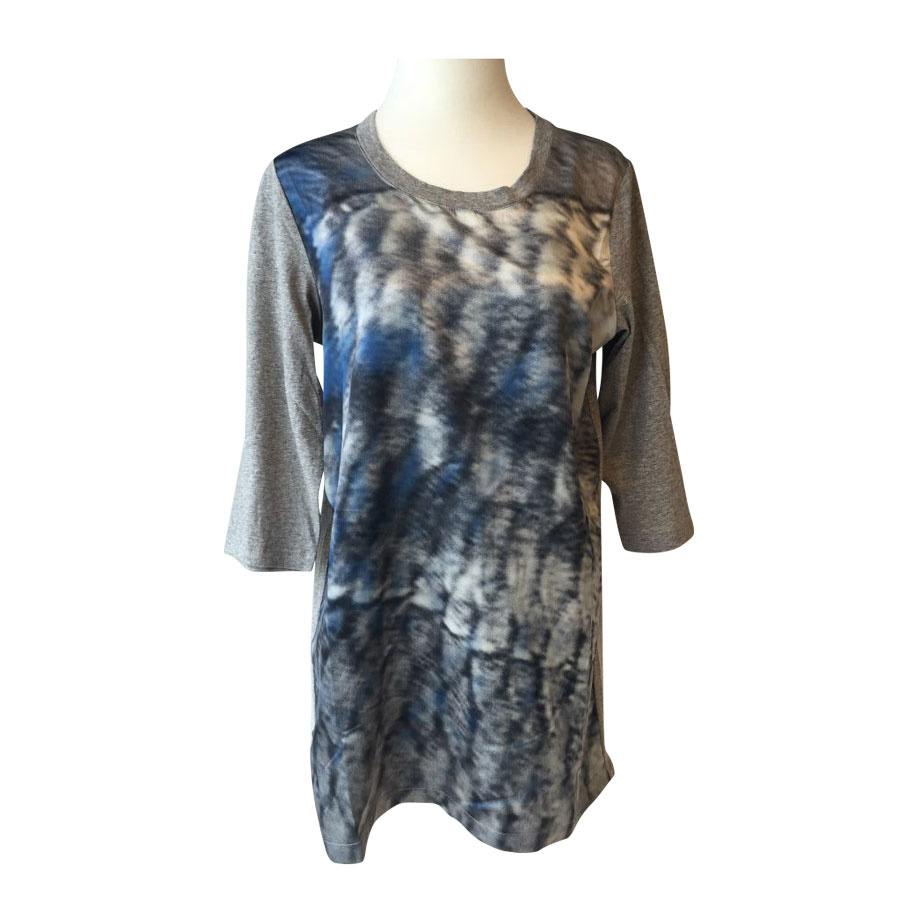 Pæn tunika med print og gråmeleret stof. Tunikaen i grå melange er med ¾ ærmer og rund hals. Ærmerne og ryggen er gråmeleret, fronten på tunikaen er i et flot gråt og blåt print. Ryggen på tunikaen runder for neden, og er derfor en smule længere end fronten