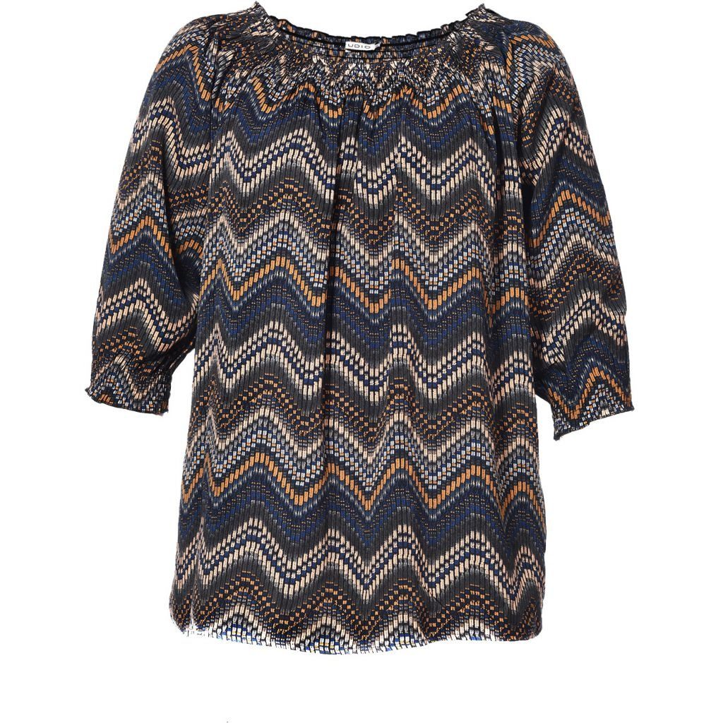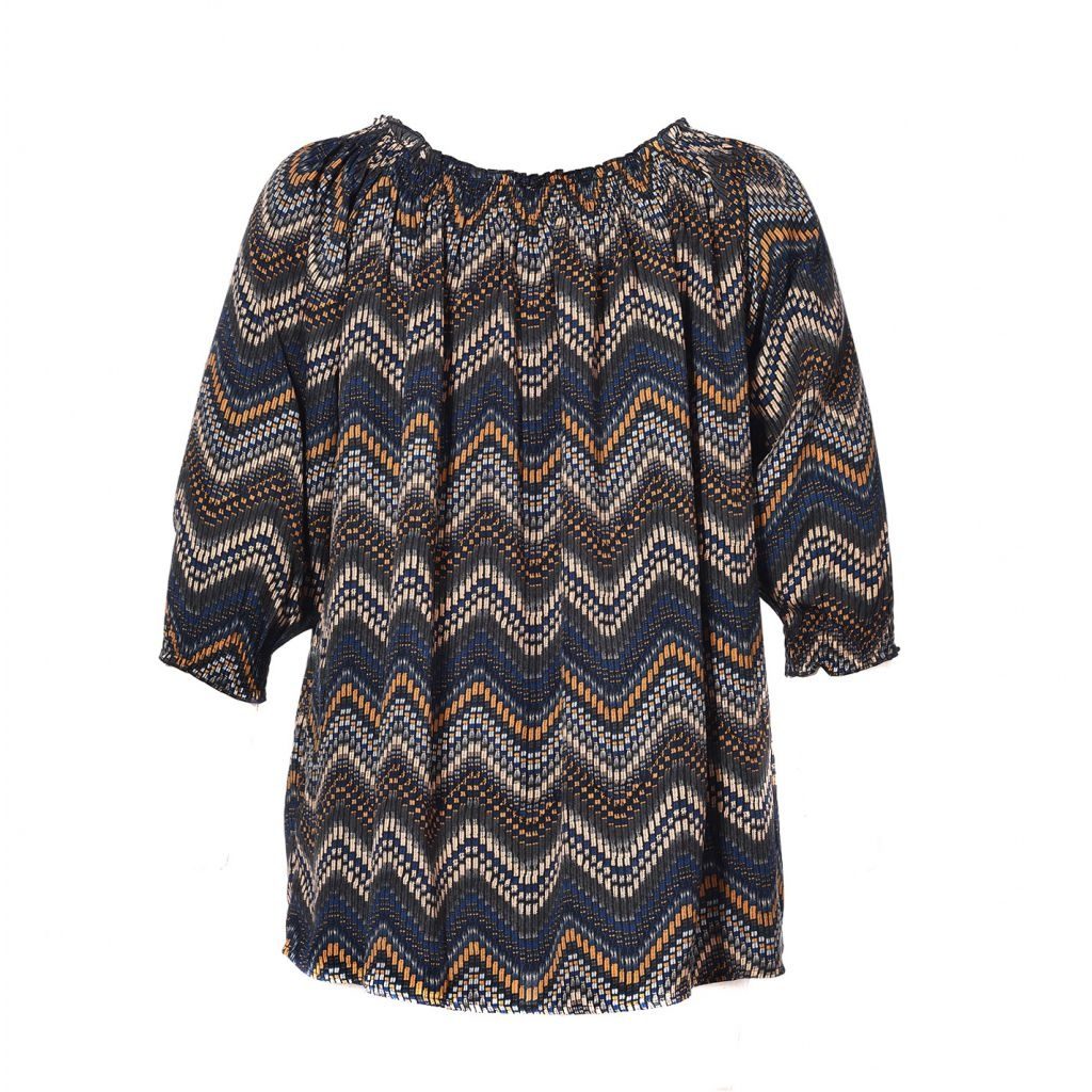 Let og lækker bluse i en blød viskose metervare med et flot grafisk print i klare farver. Blusen er med lange ærmer, der nederst afsluttes med en smock kant. Smock elastikken går igen i den runde halsudskæring.