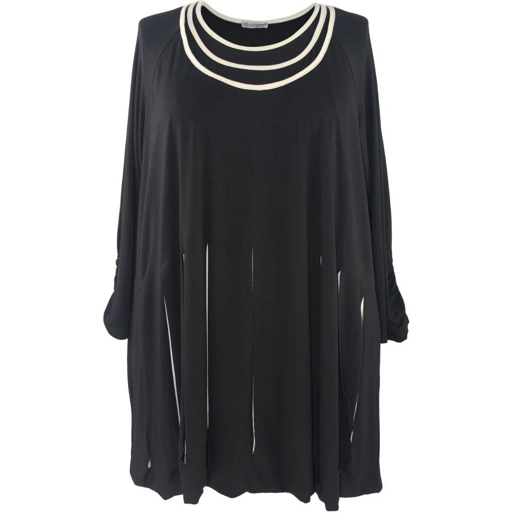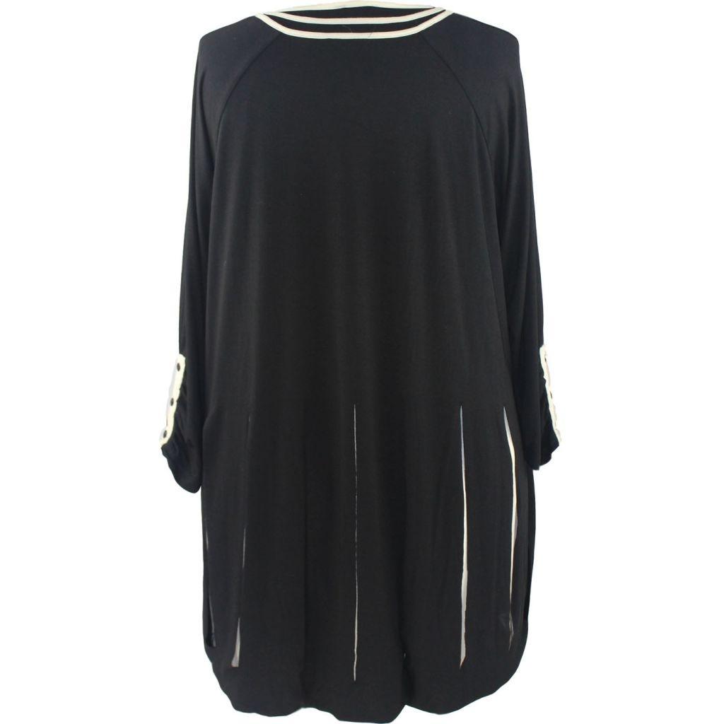 Super flot tunika med lækre effekter. Tunikaen er i to lag jersey, det inderste lag er cremefarvet og det yderste lag er sort. Det yderste lag stof er klippet, så der er sprækker ind til det inderste cremefarvede lag, og det giver en virkelig flot effekt. Tunikaen har lange ærmer, nederst på ærmegabet er en cremefarvet falsk knaplukning med tre sorte knapper.