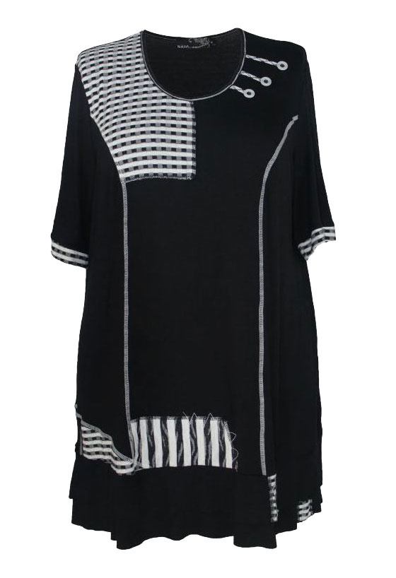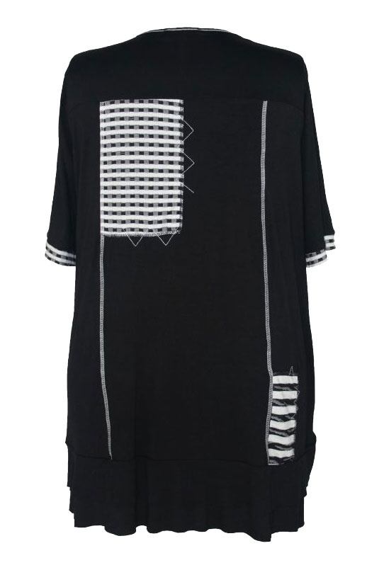 Lækker kortærmet tunika i sort med spændende mønstrede detaljer i sort og hvid.
