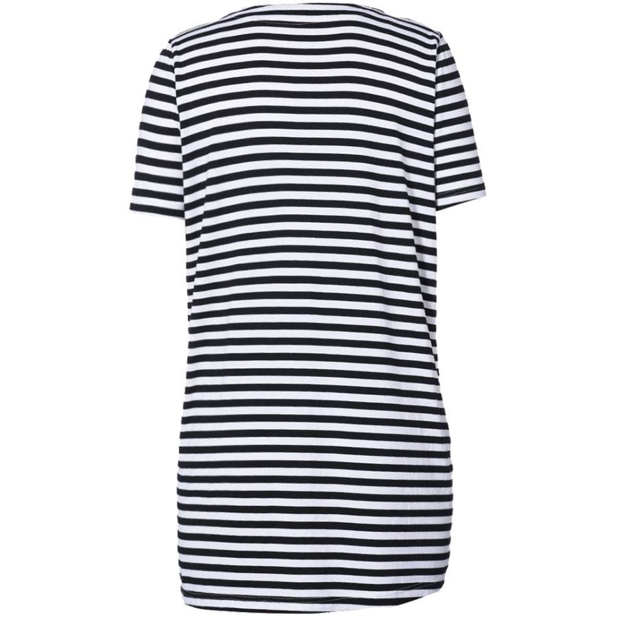Pæn sort og hvid stribet tunika med korte ærmer. Tunikaen er v-udskæring og sort bindebånd i halsen. Tunikaen er i en lækker viskose jersey.