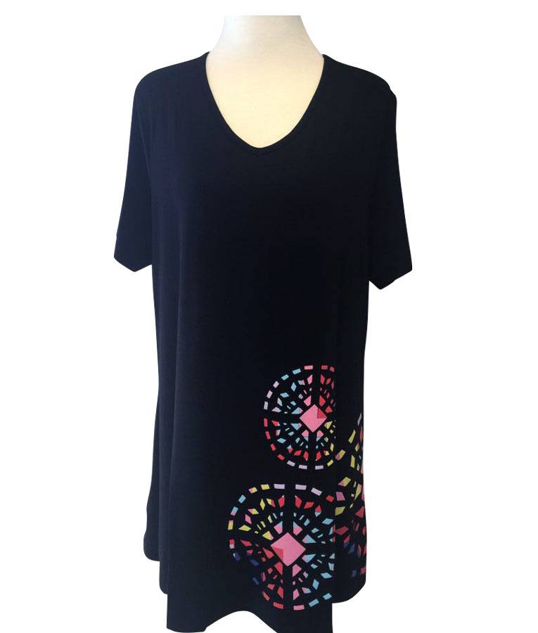 Sød sort tunika med korte ærmer. Tunikaen er i A-facon med v-hals. På fronten er der i venstre side tre printede cirkler i klare farver. Flot tunika i en lækker viskose. Tunikaen er flot over både jeans og leggins.