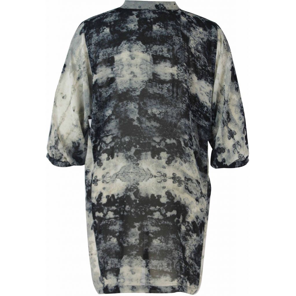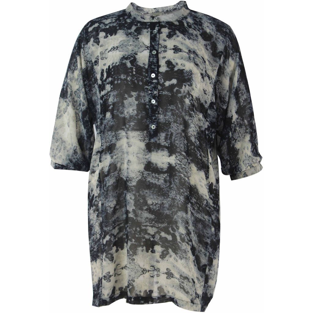 Lækker lang skjorte-tunika i chiffon med et grafisk mønster i mange blå farver. Tunikaen er med Kina-krave og ¾ ærmer. Tunikaen kan knappes op foran, hvor der på den øverste halvdel er 6 knapper.